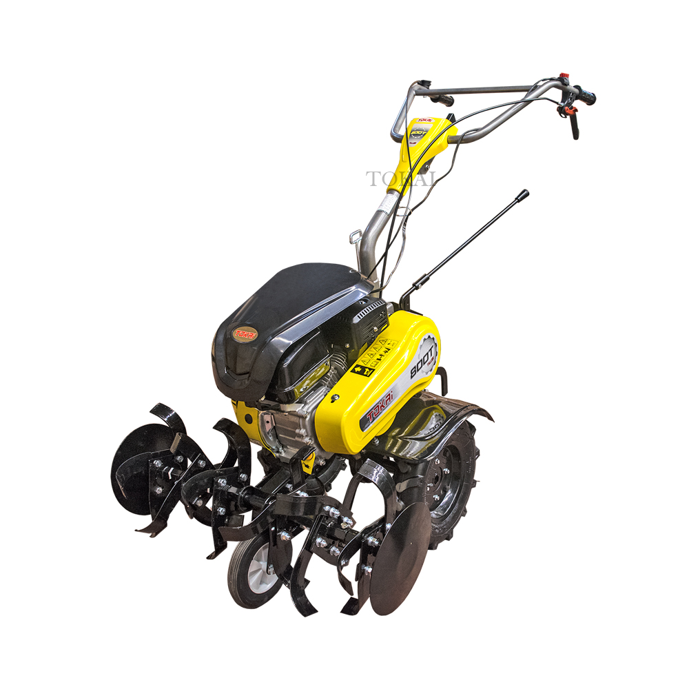 Tokai 800T is heavy duty and powerful mini tiller comes with a small size, a light weight, multiple functions, high rotary tilling efficiency, ability to work on mountains, in water, to cross ridges of fields and ditches, and easy transport and operation of turning around, this model of tiller is specially suitable for work in mountain areas, hilly area, arid fields, irrigated fields, orchards, gardens, arch-roofed sheds, and etc. Tokai 800T provides adjustable front wheel. When the tiller on road, the front wheel should be on the ground and when the tiller is going to till the field, move the front wheel up. The technique of use is very simple, save energy and time.